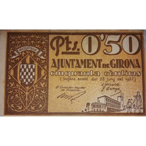 (Translation: Pesetas 0.50 City Council of Girona Fifty Centimos (By agreement of June 25, 1937.))
