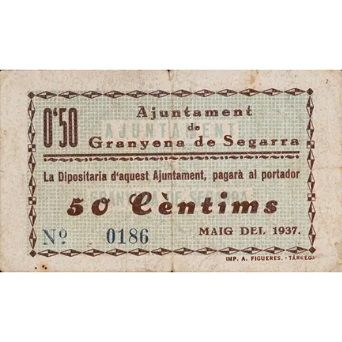 0`50 Ajuntament de Granyena de Segarra La Dipositaria d`aquest Ajuntament, pagará al portador 50 Cèntims MAIG DEL 1937. (Translation: City Council of Granyena de Segarra The Depository of this City Council will pay the bearer 50 Centimos May 1937.) |