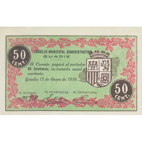 | Ön yüz lejandı | 50 CENT. CONSEJO MUNICIPAL ADMINISTRATIVO GUADIX El Consejo pagará al portador 50 Centimos, en moneda usual y corriente. Guadix 15 de Enero de 1938. (Translation: 50 Centimos Municipal Administrative Council Guadix The Council will pay the bearer 50 Centimos, in usual and current currency. Guadix January 15, 1938.) |