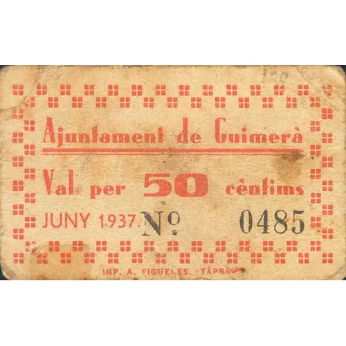 Ajuntament de Guimerà Val per 50 cèntims JUNY 1937 (Translation: City Council of Guimerà Valid for 50 Centimos June 1937) |