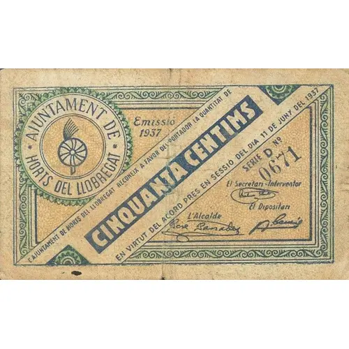 | Obverse lettering | AJUNTAMENT D`HORTS DEL LLOBREGAT Emissió 1937 L`AJUNTAMENT D`HORTS DEL LLOBREGAT RECONEIX A FAVOR DEL PORTADOR LA QUANTITAT DE CINQUANTA CENTIMS EN VIRTUT DE L`ACORD PRES EN SESSIÓ DEL DIA 11 DE JUNY DEL 1937 (Translation: City Council of Horts del Llobregat Issue 1937 The City Council of Horts del Llobregat recognizes in favor of the bearer the amount of Fifty Centimos Pursuant to the agreement reached in session on June 11, 1937) |