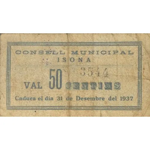 CONSELL MUNNICIPAL ISONA VAL 50 CENTIMS Caduca el dia 31 de Desembre del 1937 (Translation: Municipal Council Isona Voucher 50 Centimos Expires on December 31, 1937) |