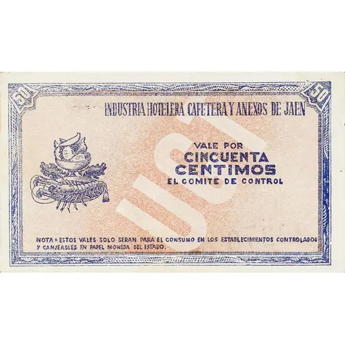50 INDUSTRIA HOTELERA CAFETERA Y ANEXOS DE JAEN VALE POR CINCUENTA CENTIMOS EL COMITE DE CONTROL NOTA = ESTOS VALES SOLO SERAN PARA EL CONSUMO EN LOS ESTABLECIMIENTOS CONTROLADOS Y CANJEABLES EN PAPEL MONEDA DEL ESTADO. UGT (Translation: Hotel & Coffee Industry and Annexes of Jaen Voucher for Fifty Centimos The Control Committee Note = These vouchers will only be for consumption in controlled establishments and redeemable in state paper money.) |