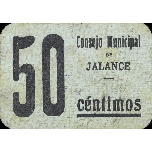 50 céntimos Consejo Municipal DE JALANCE (Translation: 50 Centimos Municipal Council of Jalance) |