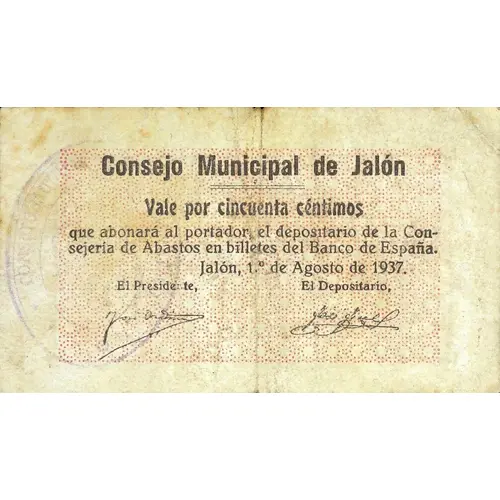 Consejo Municipal de Jalón Vale por cincuenta céntimos que abonará al portador, el depositario de la Consejería de Abastos en billetes del Banco de España. Jalón, 1.º de Agosto de 1937. (Translation: Municipal Council of Jalón Voucher for Fifty Centimos which will be paid to the bearer by the depositary of the Supply Department in banknotes from the Bank of Spain. Jalón, August 1, 1937.) |