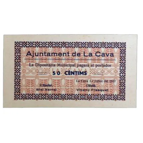 Ajuntament de La Cava La Dipositaria Municipal pagarà al portador 50 CÈNTIMS La Cava 1er Juliol del 1937 (Translation: City Council of La Cava The Municipal Depositary will pay the bearer 50 Centimos La Cava, July 1, 1937) |