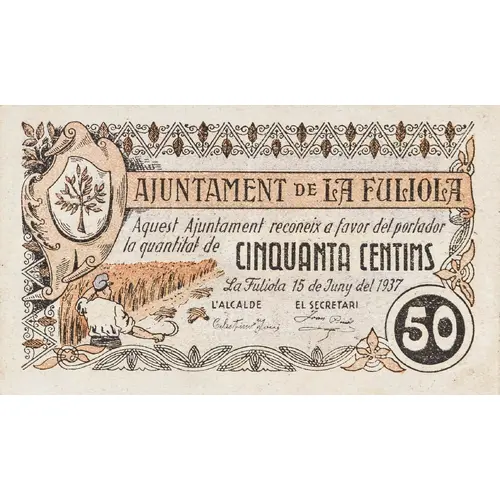 AJUNTAMENT DE LA FULIOLA Aquest Ajuntament reconeix a favor del portador la quantitat de CINQUANTA CENTIMS La Fuliola 15 de Juny del 1937 50 (Translation: City Council of La Fuliola This City Council recognizes in favor of the bearer the amount of Fifty Centimos La Fuliola June 15, 1937) |
