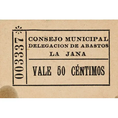 CONSEJO MUNICIPAL DELEGACIÓN DE ABASTOS LA JANA VALE 50 CÉNTIMOS (Translation: Municipal Council Supplies Delegation La Jana It`s worth 50 Centimos) |