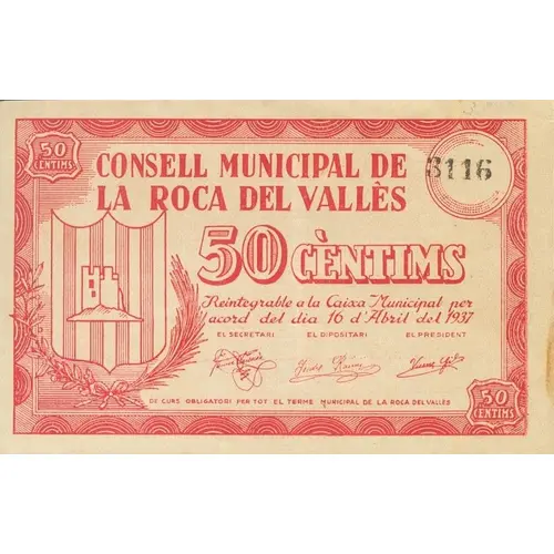 (Translation: 50 Centimos Municipal Council of La Roca del Vallès 50 Centimos Reintegratable to the Municipal Treasury by agreement of April 16, 1937. Mandatory course for all the Municipal term of La Roca del Vallès)