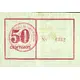 | Reverse description | Red lettering with single line perimeter framing and vertical line dividing banknote and round municipal stamp |