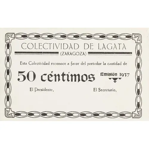 COLECTIVIDAD DE LAGATA (ZARAGOZA) Esta Colectividad reconoce a favor del portador la cantidad de 50 céntimos Emisión 1937 (Translation: Collectivity of Lagata (Zaragoza) This Collectivity recognizes in favor of the bearer the amount of 50 Centimos Issue 1937) |