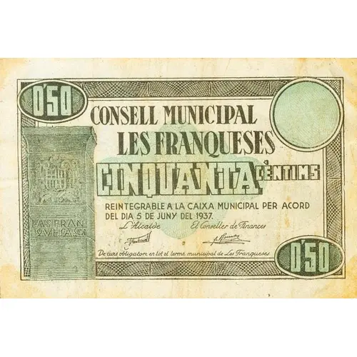 0`50 CONSELL MUNICIPAL DE LES FRANQUESES CINQUANTA CÈNTIMS REINTEGRABLE A LA CAIXA MUNICIPAL PER ACORD DEL DIA 5 DE JUNY DEL 1937 De curs obligatori en tot el terme municipal de Les Franqueses (Translation: Municipal Council of Les Franqueses Fifty Centimos Refundable to the `Caixa Municipal` by agreement of June 5, 1937 Of mandatory course in all the municipal term of Les Franqueses) |