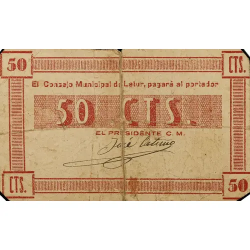 50 CTS. El Consejo Municipal de Letur, pagará al portador 50 CTS. (Translation: 50 Centimos The Municipal Council of Letur will pay the bearer 50 Centimos) |