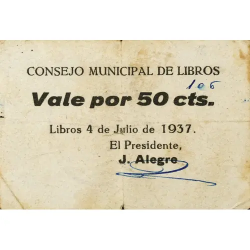 CONSEJO MUNICIPAL DE LIBROS Vale por 50 cts. Libros 4 de Julio de 1937 El Presidente, J. Alegre (Translation: Municipal Council of Libros Voucher for 50 Centimos Libros July 4, 1937 The President, J. Alegre) |