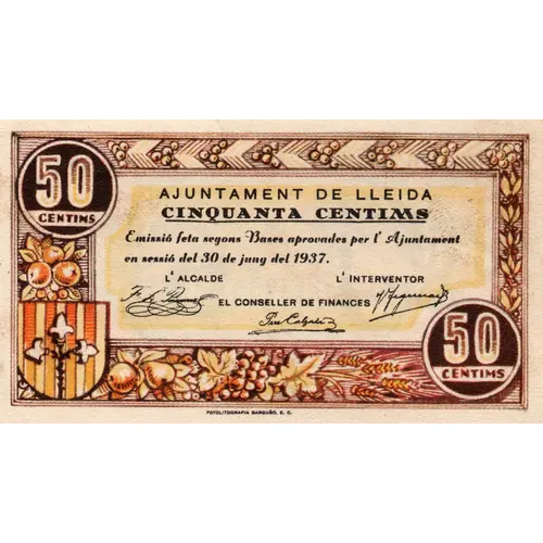 (Translation: 50 Centimos City Council of Lleida Fifty Centimos Issue made according to Rules approved by the City Council in session of June 30, 1937.)