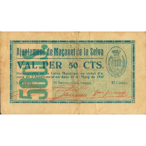 Ajuntament de Maçanet de la Selva VAL PER 50 CTS. Reintegrable a la Caixa Municipal en virtut d`acord de l`Ajuntament en data 19 de Maig del 1937. (Translation: City Council of Maçanet de la Selva Valid for 50 Centimos Refundable to the `Caixa Municipal` by agreement of the City Council on May 19, 1937.) |