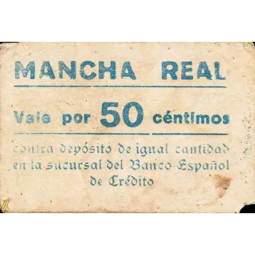 MANCHA REAL Vale por 50 céntimos contra depósito de igual cantidad en la Sucursal del Banco Español de Crédito (Translation: Mancha Real Voucher for 50 Centimos Against deposit of equal amount at the Spanish Credit Bank branch) |