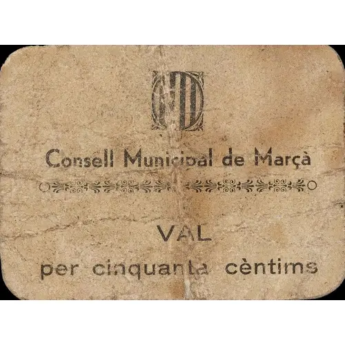 Consell Municipal de Marçà Val per cinquanta cèntims (Translation: Municipal Council of Marçà Valid for Fifty Centimos) |
