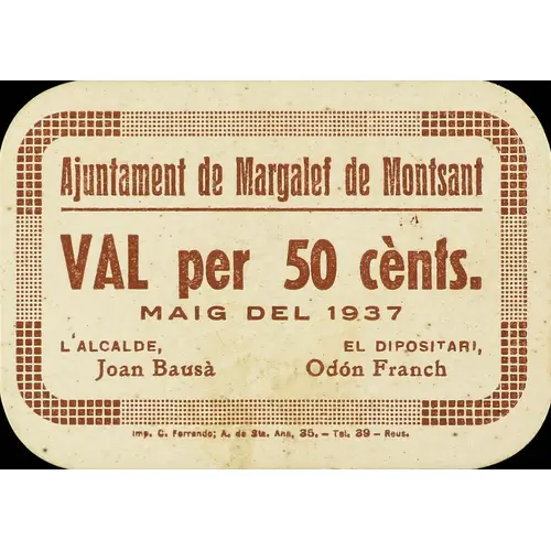Ajuntament de Margalef de Montsant VAL per 50 cènts. MAIG DEL 1937 (Translation: City Council of Margalef de Montsant Voucher for 50 Centimos May, 1937.) |