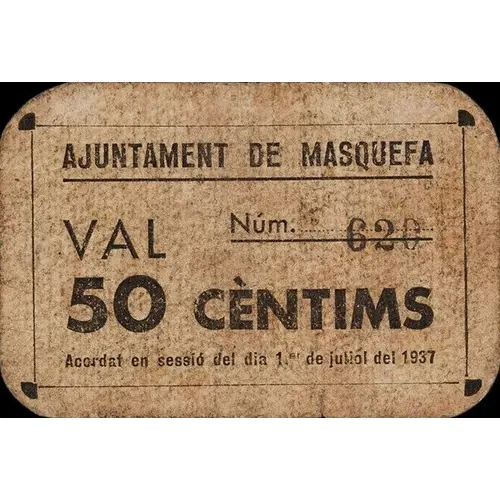 AJUNTAMENT DE MASQUEFA VAL 50 CENTIMS Acordat en sessió del dia 1.er de juliol del 1937 (Translation: City Council of Masquefa It is worth 50 Centimos Agreed in session on July 1, 1937) |