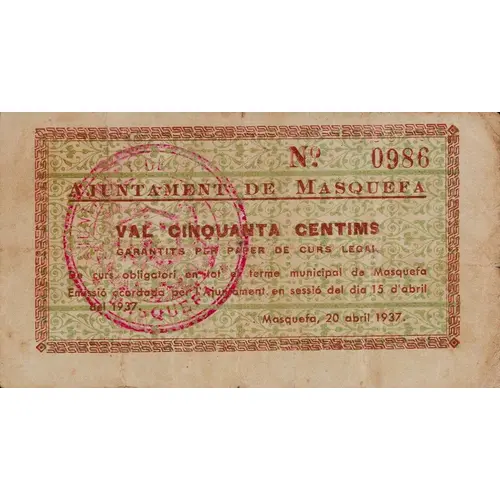 AJUNTAMENT DE MASQUEFA VAL CINQUANTA CENTIMS GARANTITS PER PAPER DE CURS LEGAL De curs obligatori en tot el terme municipal de Masquefa Emissió acordada per l`Ajuntament en sessió del dia 15 d`abril del 1937. Masquefa, 20 abril 1937. (Translation: City Council of Masquefa It is worth Fifty Centimos Guaranteed by legal current paper Compulsory course throughout the Masquefa municipality Issue agreed by the City Council in session on April 15, 1937. Masquefa, April 20, 1937.) |
