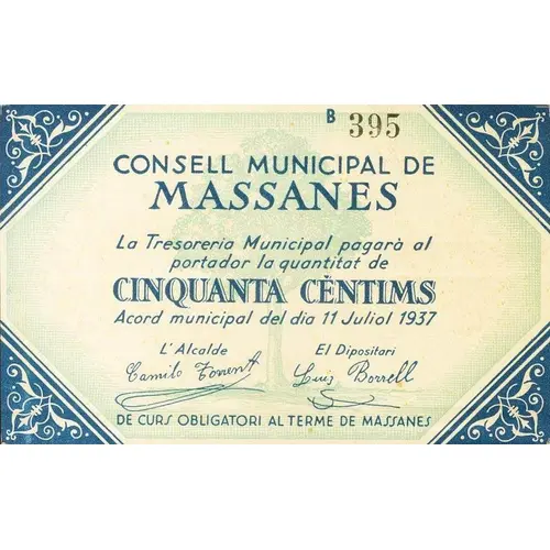 CONSELL MUNICIPAL DE MASSANES La Tresoreria Municipal pagarà al portador la quantitat de CINQUANTA CÈNTIMS Acord municipal del dia 11 Juliol 1937 DE CURS OBLIGATORI AL TÈRME DE MASSANES (Translation: Municipal Council of Massanes The Municipal Treasury will pay the bearer the amount of Fifty Centimos Municipal agreement of July 11, 1937 Of mandatory course in the term of Massanes) |
