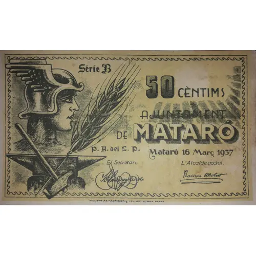 50 CÈNTIMS AJUNTAMENT DE MATARÓ Mataró 16 Març 1937 (Translation: 50 Centimos City Council of Mataró Mataró, March 16, 1937) |