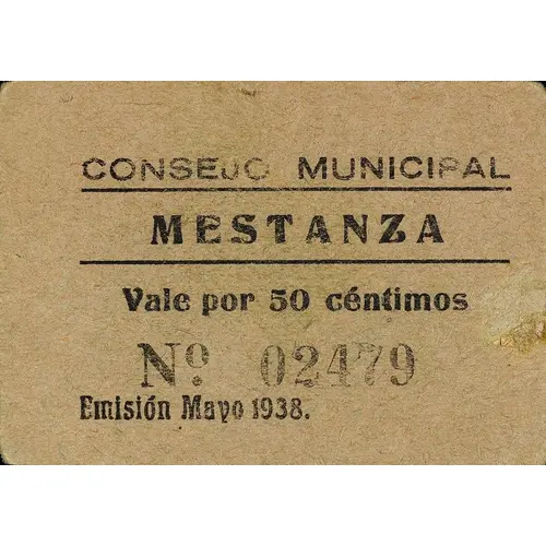 | 正面铭文 | CONSEJO MUNICIPAL MESTANZA Vale por 50 céntimos Emisión Mayo 1938. (Translation: Municipal Council Mestanza Valid for 50 Centimos Issue May 1938.) |