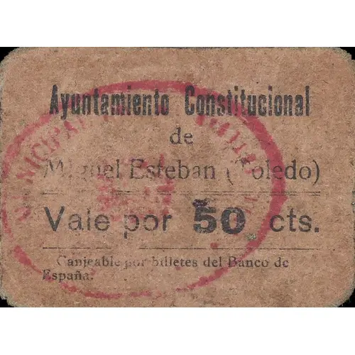 Ayuntamiento Constitucional de Miguel Esteban (Toledo) Vale por 50 cts. Canjeable por billetes del Banco de España. (Translation: Constitutional City Council of Miguel Esteban (Toledo) Voucher for 50 Centimos Exchangeable for banknotes from the Bank of Spain.) |