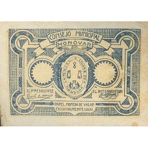 表面の銘文 CONSEJO MUNICIPAL MONÓVAR LA M. N. I. F. L. (Muy Noble Ilustre Fiel Leal) CIUDAD DE MONOVAR PAPEL MONEDA DE VALOR EXCUSIVAMENTE LOCAL