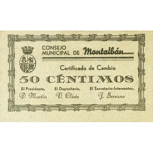 Certificado de Cambio 50 céntimos Montalbán, 1º. de Junio de 1937 Nota.- Estos certificados de cambio son de curso obligatorio dentro de este término y su valor será canjeado por billetes del Banco de España en la Caja Municipal. (Translation: Exchange Certificate 50 Centimos Montalbán, 1st. June 1937 Note.- These exchange certificates are mandatory within this term and their value will be exchanged for Bank of Spain banknotes at the Municipal Fund.) |