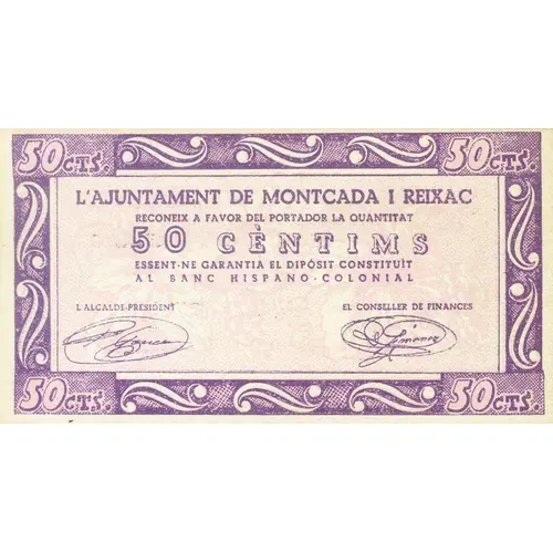 50 CTS. L`AJUNTAMENT DE MONTCADA I REIXAC RECONEIX A FAVOR DEL PORTADOR LA QUANTITAT 50 CÈNTIMS ESSENT-NE GARANTIA EL DIPOSIT CONSTITUIT AL BANC HISPANO COLONIAL (Translation: 50 Centimos The City Council of Montcada i Reixac recognizes in favor of the bearer the amount 50 Centimos The deposit made in the Banco Hispano Colonial being a guarantee) |