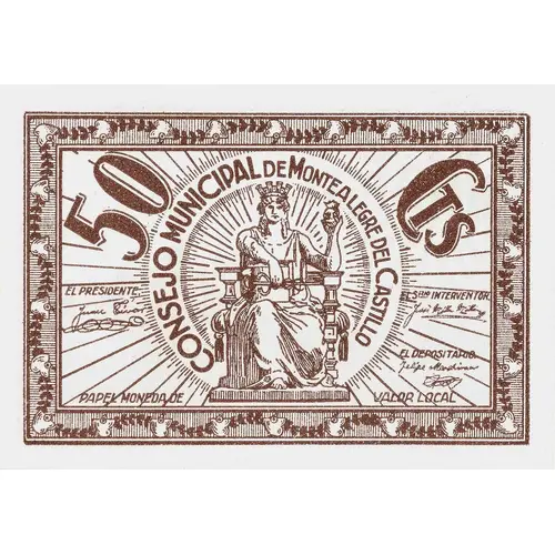 50 CTS CONSEJO MUNICIPAL DE MONTEALEGRE DEL CASTILLO PAPEL MONEDA DE VALOR LOCAL (Translation: 50 Centimos Municipal Council of Montealegre del Castillo Local value paper money) |