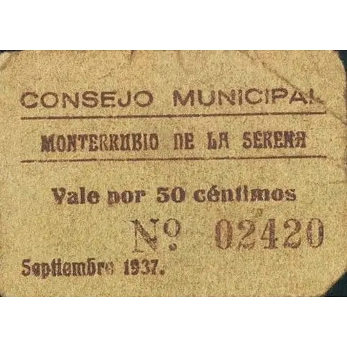 CONSEJO MUNICIPAL MONTERRUBIO DE LA SERENA Vale por 50 céntimos Septiembre 1937. (Translation: Municipal Council Monterrubio de la Serena Valid for 50 Centimos September 1937.) |