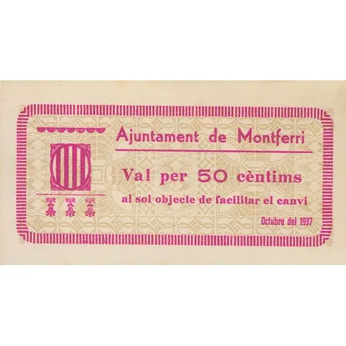 Ajuntament de Montferri Val per 50 cèntims al sol objecte de facilitar el canvi Octubre del 1937 (Translation: City Council of Montferri Valid for 50 Centimos For the sole purpose of facilitating change October 1937) |