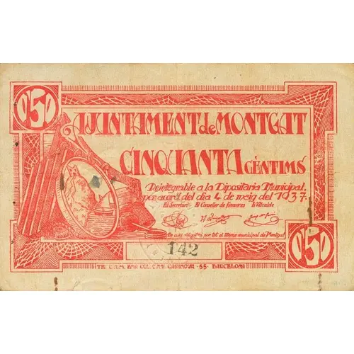 0`50 AJUNTAMENT DE MONTGAT CINQUANTA CÈNTIMS Reintegrable a la Dipositaria Municipal per acord del dia 4 de maig del 1937. De curs obligatori per tot el terme municipal de Montgat (Translation: City Council of Montgat One Peseta Refundable to the Municipal Depository by agreement of May 4, 1937. Mandatory course throughout the municipality of Montgat.) |