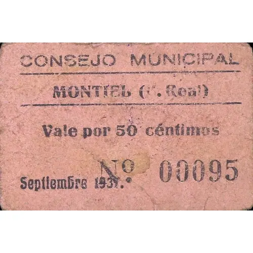CONSEJO MUNICIPAL MONTIEL (C. Real) Vale por 50 céntimos Septiembre 1937. (Translation: Municipal Council Montiel (Ciudad Real) Valid for 50 Centimos September 1937.) |