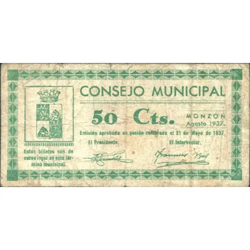 CONSEJO MUNICIPAL 50 Cts. MONZÓN Agosto 1937. Emisión aprobada en sesión celebrada el 21 de Mayo de 1937. Estos billetes son de curso legal en este término municipal. (Translation: Municipal Council 50 Centimos. Monzon August 1937. Emission approved in session held on May 21, 1937. These banknotes are legal tender in this municipality.) |