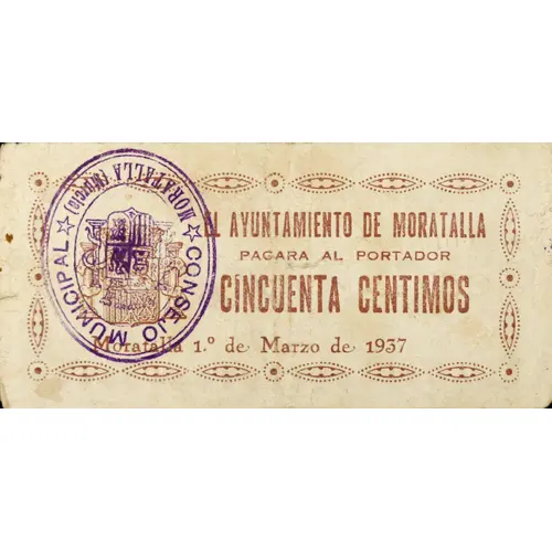 EL AYUNTAMIENTO DE MORATALLA PAGARA AL PORTADOR CINCUENTA CENTIMOS Moratalla 1.º de Marzo de 1937 (Translation: The City Council of Moratalla Will pay the bearer Fifty Centimos Moratalla, March 1, 1937) |