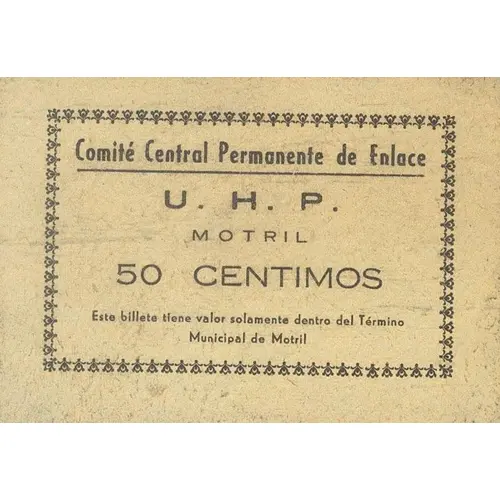 Comité Central Permanente de Enlace U. H. P. MOTRIL 50 CENTIMOS Este billete tiene valor solamente dentro del Término Municipal de Motril (Translation: Permanent Central Liaison Committee U.H.P. Motril 50 Centimos This banknote has value only within the Municipal Term of Motril) |