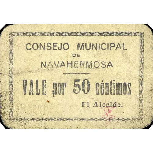CONSEJO MUNICIPAL DE NAVAHERMOSA VALE por 50 céntimos (Translation: Municipal Council of Navahermosa Voucher for 50 Centimos) |