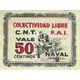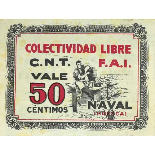 | Opschrift voorzijde | Colectividad Libre C.N.T F.A.I. VALE 50 CÉNTIMOS NAVAL (HUESCA) (Translation: Free Collectivity C.N.T F.A.I. Voucher 50 Centimos Naval (Huesca)) |