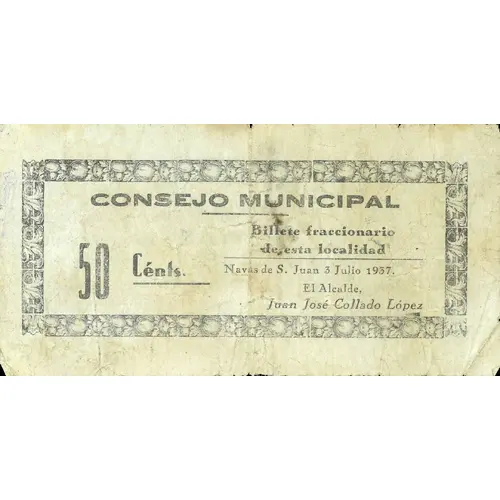 CONSEJO MUNICIPAL 50 Cénts. Billete fraccionario de esta localidad Navas de S. Juan 3 Julio 1937. (Translation: Municipal Council 50 Centimos Fractional banknote of this town Navas de San Juan July 3, 1937.) |