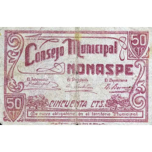 50 CTS Consejo Municipal NONASPE CINCUENTA CTS De curso obligatorio en el territorio Municipal (Translation: 50 Centimos Municipal Council Nonaspe Fifty Centimos Mandatory course in the Municipal territory) |
