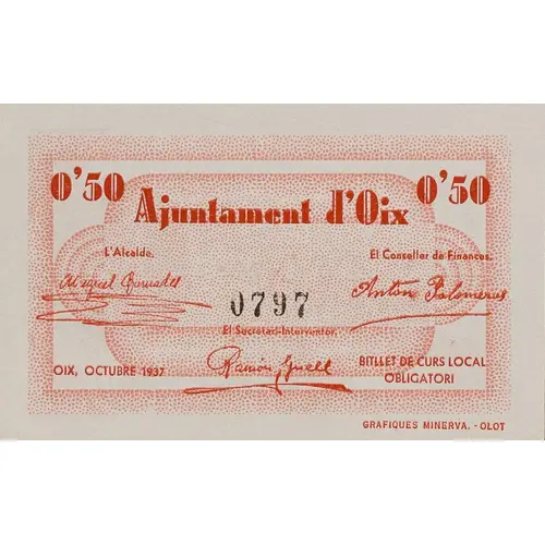 0`50 Ajuntament d`Oix OIX, OCTUBRE 1937 BITLLET DE CURS LOCAL OBLIGATORI (Translation: City Council of Oix Oix, October 1937 Mandatory local course banknote) |