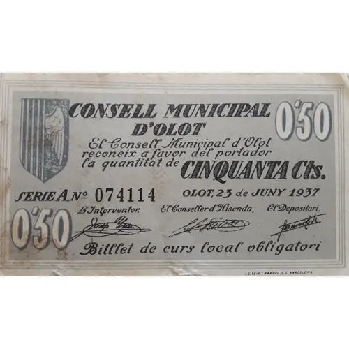 0`50 CONSELL MUNICIPAL D`OLOT EL Consell Municipal d`Olot reconeix a favor del portador la quantitat de CINQUANTA Cts. OLOT, 23 de JUNY 1937 Bitllet de curs local obligatori (Translation: Municipal Council of Olot The Municipal Council of Olot recognizes in favor of the bearer the amount of Fifty Centimos Olot, June 23, 1937 Mandatory local course banknote) |