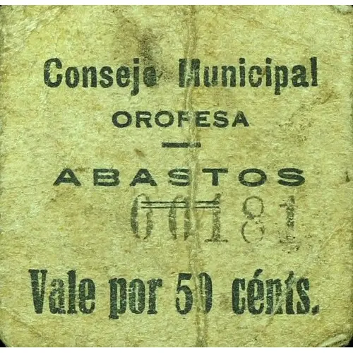 Consejo Municipal OROPESA ABASTOS Vale por 50 cénts. (Translation: Municipal Council Oropesa Supplies Voucher for 50 Centimos) |