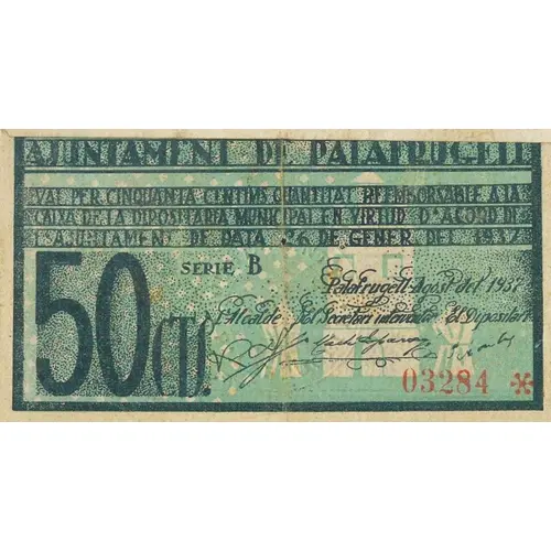 AJUNTAMENT DE PALAFRUGELL VAL PER CINQUANTA CENTIMS QUANTITAT REEMBORSABLE A LA CAIXA DE LA DIPOSITARIA MUNICIPAL EN VIRTUT D`ACORD DE L`AJUNTAMENT DE DATA 26 DE GENER DEL 1937 Palafrugell Agost del 1937 50 CTS. (Translation: City Council of Palafrugell It is valid for Fifty Centimos amount refundable to the `Caixa` of the Municipal Depositary, under an agreement of the City Council dated January 26, 1937. Palafrugell, August 1937. 50 Centimos) |