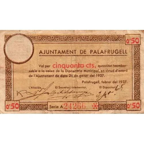 AJUNTAMENT DE PALAFRUGELL Val per cinquanta cts. quantitat reemborsable a la Caixa de la Dipositaria Municipal, en virtut d`acord de l`Ajuntament de data 26 de gener del 1937. Palafrugell, febrer del 1937. 0`50 (Translation: City Council of Palafrugell It is valid for Fifty Centimos amount refundable to the `Caixa` of the Municipal Depositary, under an agreement of the City Council dated January 26, 1937. Palafrugell, February 1937.) |