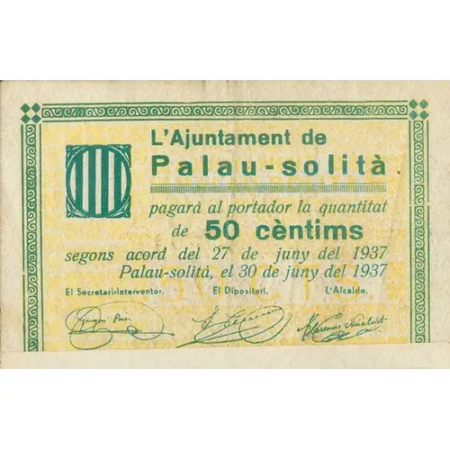 L`Ajuntament de Palau-solità pagarà al portadir la quantitat de 50 cèntims segons acord del 27 de juny del 1937 Palau-solità, el 30 de juny del 1937 (Translation: The City Council of Palau-solità will pay to the bearer the amount of 50 Centimos according to agreement of June 27, 1937 Palau-solità, June 30, 1937) |